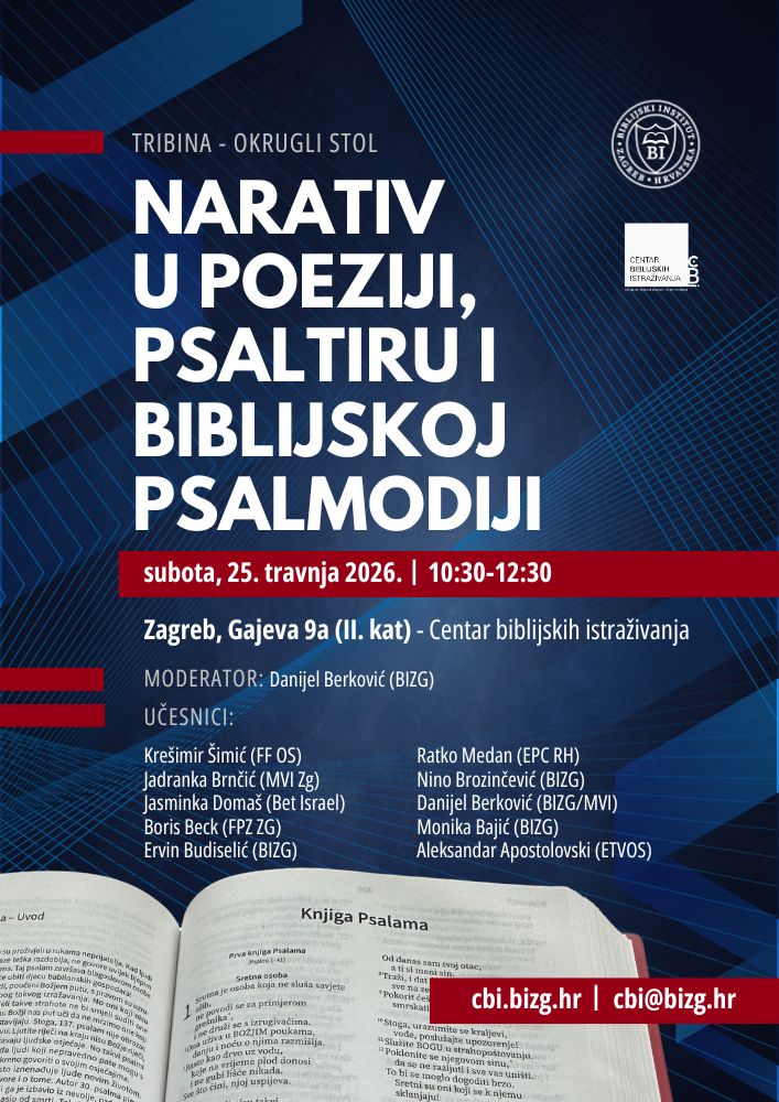 Centar biblijskih istraživanja vas poziva na okrugli stol/tribinu koja će se održati ove subote 25. travnja 2026. u prostoru čitaonice Biblijskog instituta u Gajevoj 9a, u 10:30 h. Tema je Narativ u poeziji, Psaltiru i biblijskoj psalmodiji i održava se u sklopu znanstvenog projekta Narativ i metanarativ biblijskog Psaltira i biblijske psalmodije: kako pripovijest u biblijskoj poeziji služi prijenosu sadržaja i poruke.